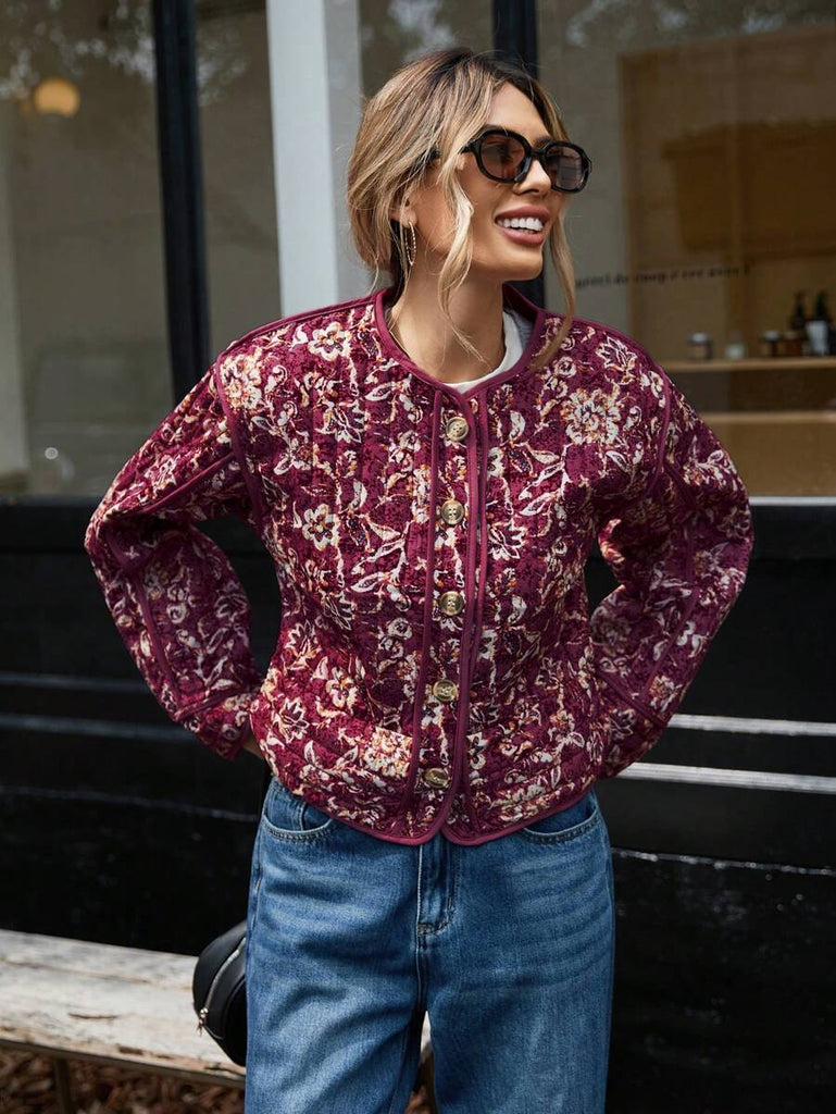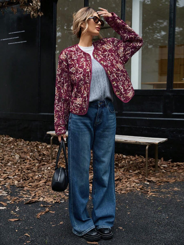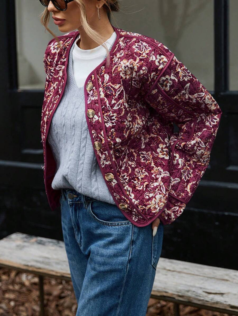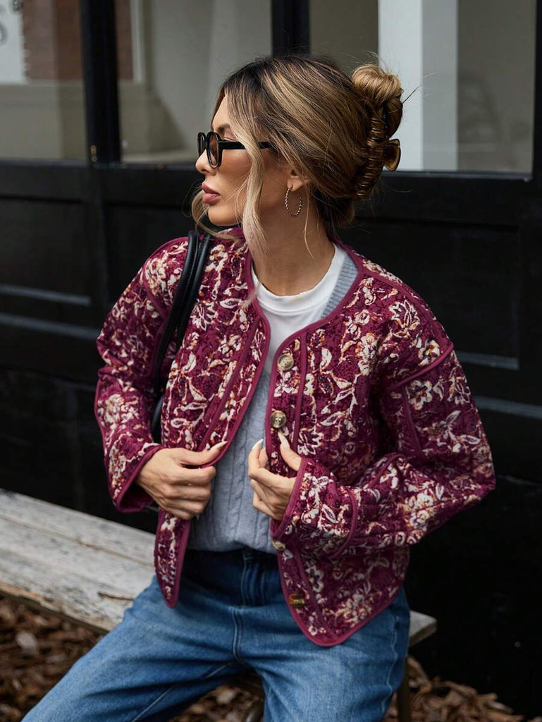 Manteau Matelassé Imprimé Floral Style Décontracté Manches Longues Avec Poches Manteau Matelassé Imprimé Floral Style Décontracté Manches Longues Avec Poches